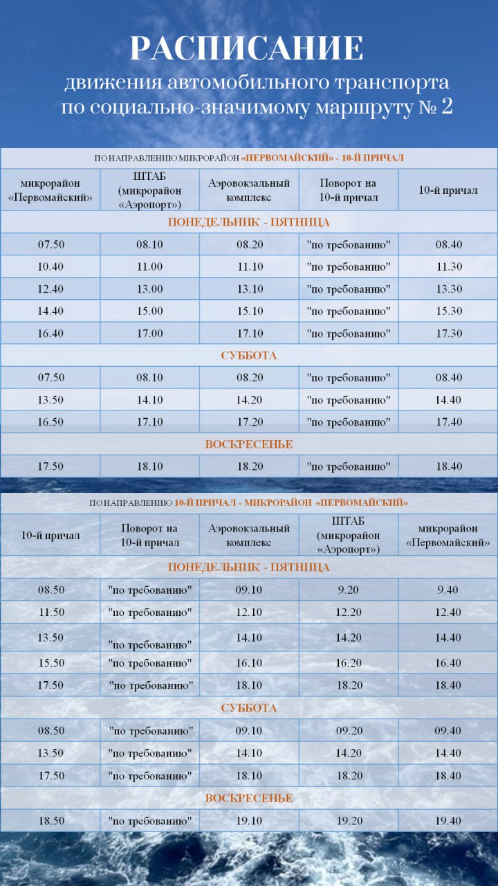 Администрация Анадырского муниципального района информирует, что с 24 июня по 31 октября 2025 года начинает курсировать автобус по социальному маршруту № 2, соединяющему 10-й причал и аэропорт «Угольный» им. Ю.С. Рытхэу.